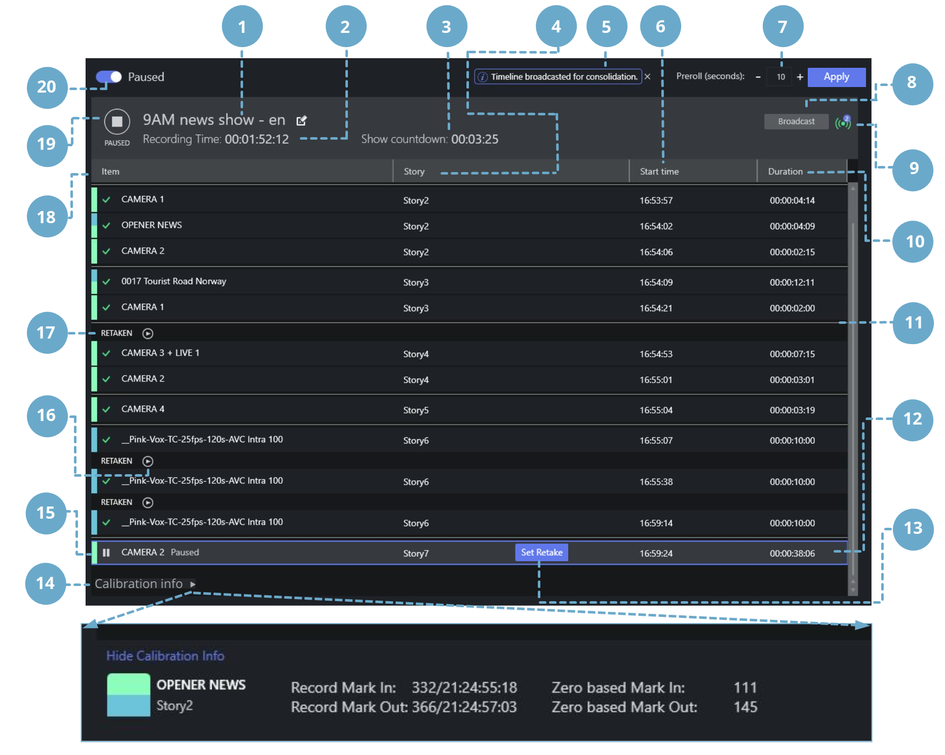 Pre-roll: A ten second (by default, but may be different on your setup) period that a camera (anchor) is given to prepare in a video production, before the production is live. At pause, this period is also used behind the scenes for the technical setup (studio equipment, clip players, graphics players, recorders and transition continuity etc.) to be made ready for the new take.