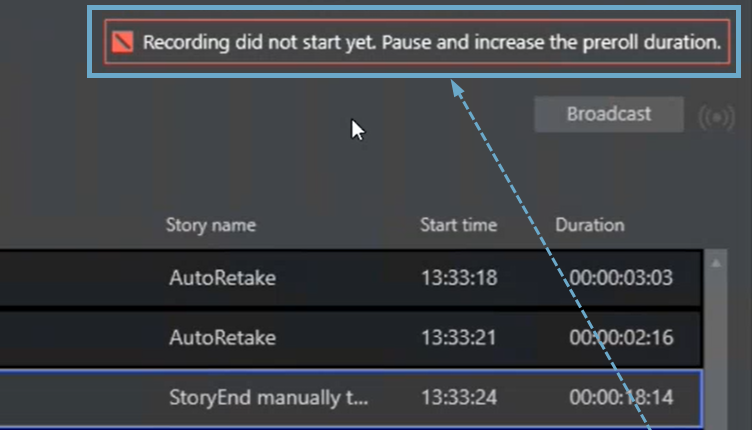this means that the pre-roll time is not long enough for the recording hardware to prepare itself for recording your story.