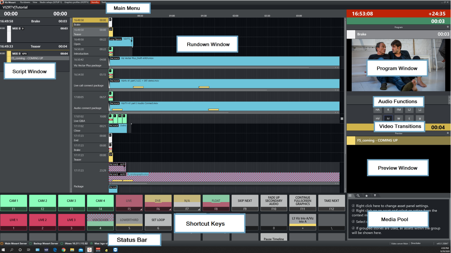 The areas of the Viz Mosart GUI are described in the following sections: