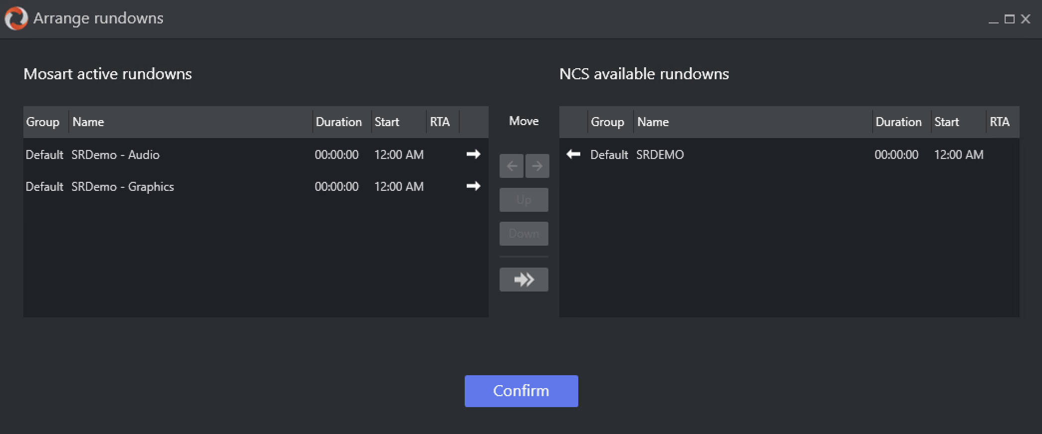 - Reorder items in the Active Rundowns list using the Move up or Move down buttons.Click Confirm.