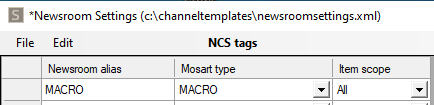Assign a newsroom alias to the Mosart type MACRO in NCS tags in the configuration file Newsroom Settings: