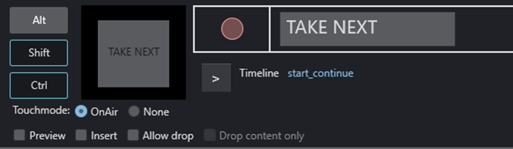 The main key appears in the rectangle, any modifier keys are highlighted to the left (in the illustration above, Shift and Ctrl).Type the name to appear on the shortcut button in the rectangle to the right (in the illustration above, the field with TRANSITION_TYPE)