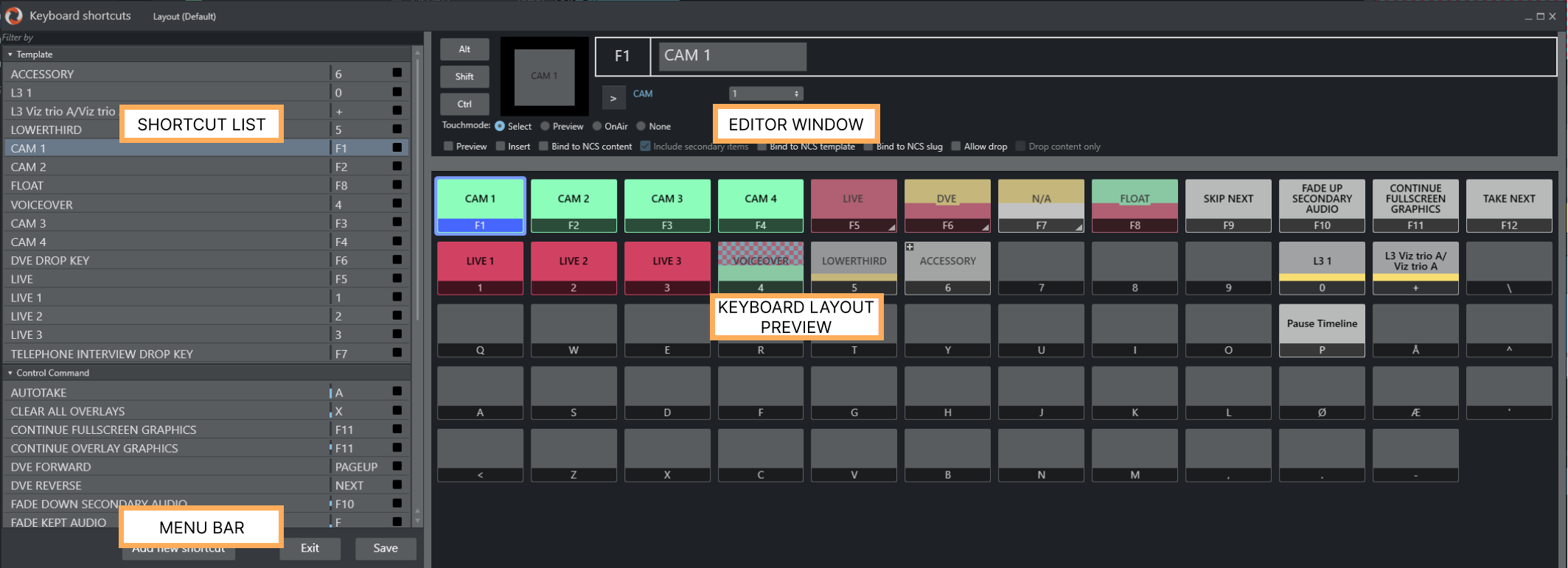All keyboard shortcuts for the Viz Mosart GUI are fully customizable.