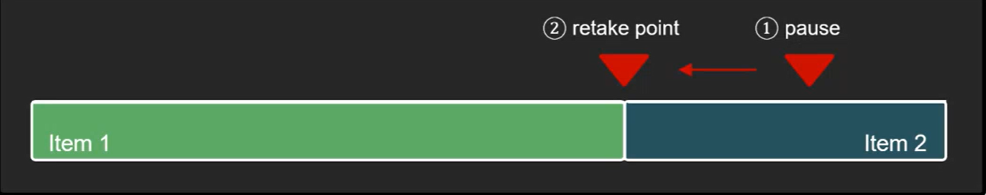 A retake point is always at the start of a primary item, regardless of where the pause was made.