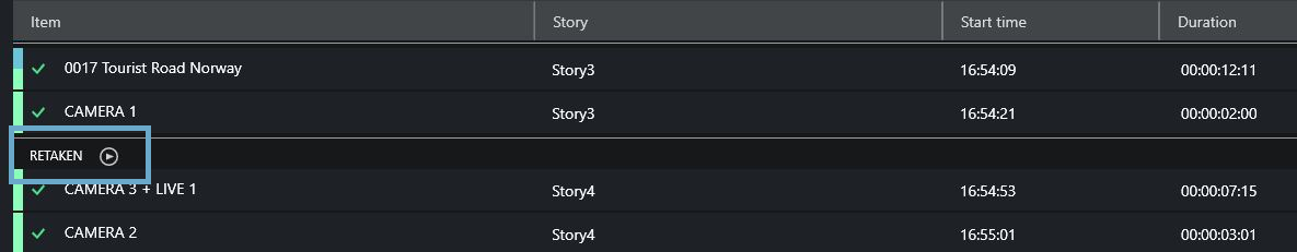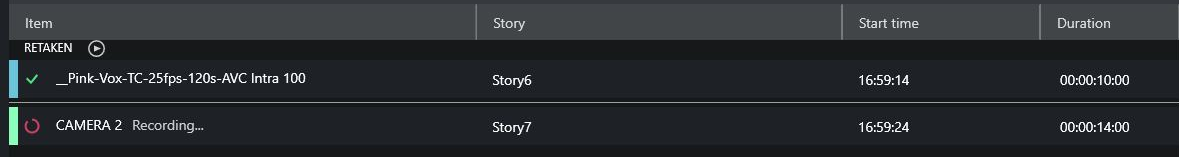 From this point on, any story items taken on air (using the standard Take Next, default F12) are recorded and displayed in the Story Recorder panel, item by item.