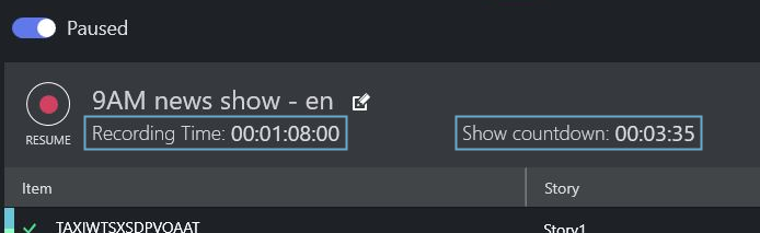The Show Countdown field displays the difference between the planned duration as defined in the NRCS and the Recording Time.