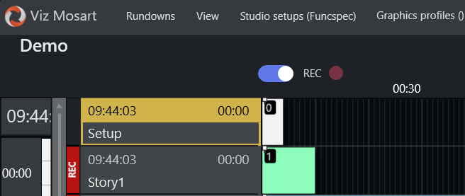 When a rundown containing tagged stories is loaded in Viz Mosart, these stories are shown with a REC indicator in the main timeline view. The Story Recorder mode toggle at the top of the timeline also indicates whether there are stories to be recorded.