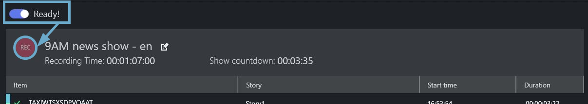 After a few seconds, the REC button is red, indicating the system is ready to record your show.If Step 2 above was performed, then execute Take Next to continue with the next story item in the show (this will be the first recorded story item). Otherwise begin the show by taking in the first story item of the show.