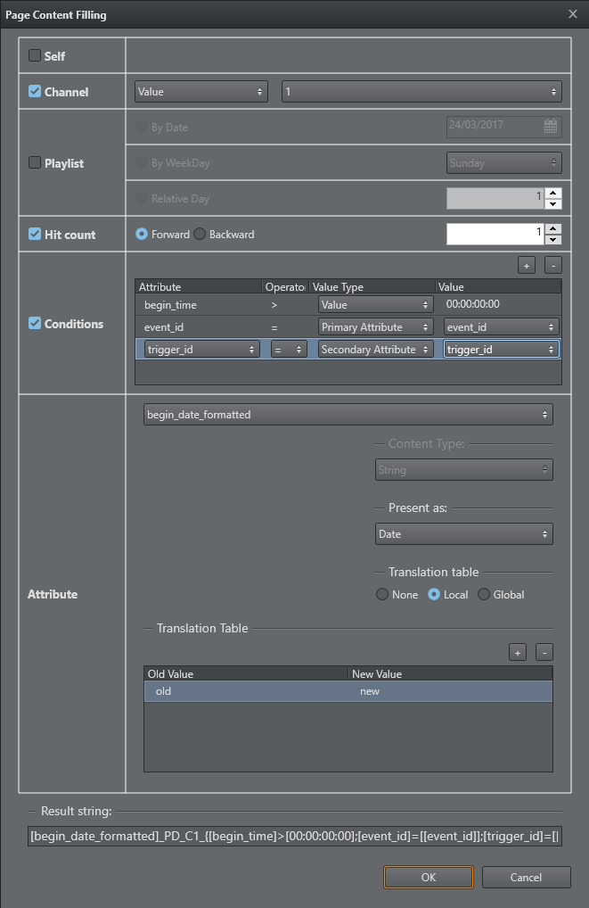 • Result string: Displays the resulting string based on your configuration of the respective fields. Can be edited.