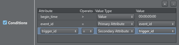 • Conditions: Looks for the first primary event that meets the conditions in the table. Any entry prefixed with secondary_ indicates it is to check data from the page (itself) and not the parent (primary element). This allows you to use secondary data (for example secondary_begin_time) to find relevant primary event data, giving more dynamic conditions.