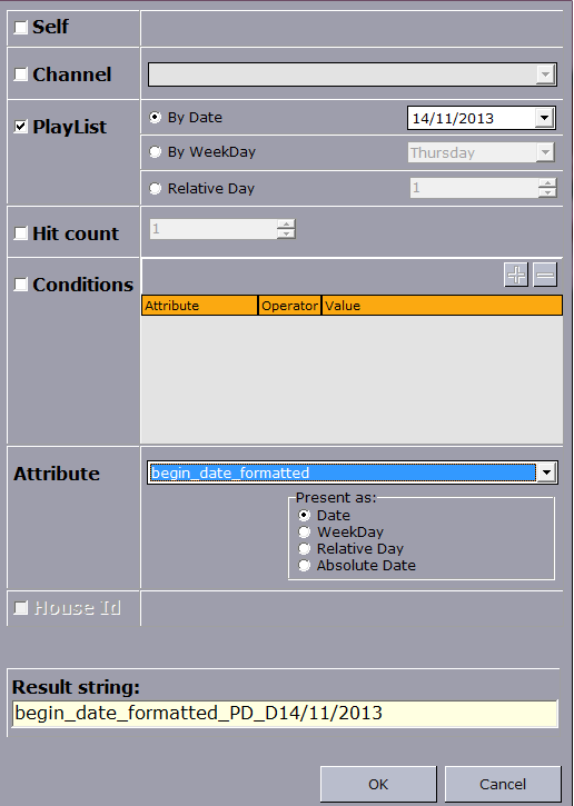For any page in previous playlist 13/11/2013, set Playlist to the newly created playlist and Attribute to begin_date_formatted: