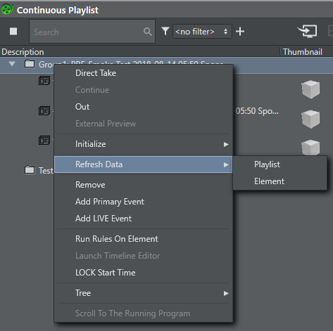 • Direct Take: Takes the playlist element directly to air. If the element is available and/or loaded it will play immediately. If not, the element will be taken on air as soon as it is.