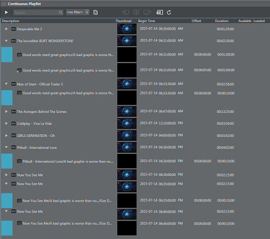Note: If there are any errors found in the playlist, the primary element(s) causing the error will be shown in red. Hover the mouse over the red no-entry icon of the error element(s) for more information.