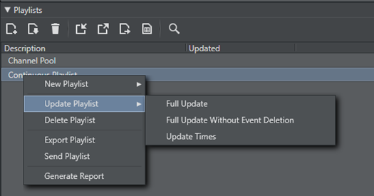 • Full Update Without Event Deletion: updates the entire playlist, primary and secondary events; however, it will not delete events that have already been added.