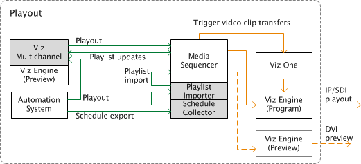 Video clip transfers from Viz One to the Viz Engine program machine are initiated by the Media Sequencer once the playlist is activated.