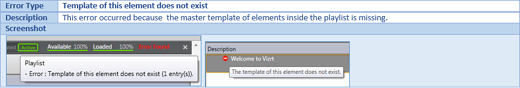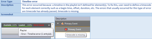 - Error state: The state of an element where it has been set incorrectly and cannot be played. Elements in error are shown in Red and will also have a tool-tip indicating what caused the error, if the error condition provides this information, which most errors do.