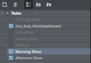 Existing rules can be activated/deactivated as required. In the example below for example the rule Another_page is deactivated while Morning_Show are activated.