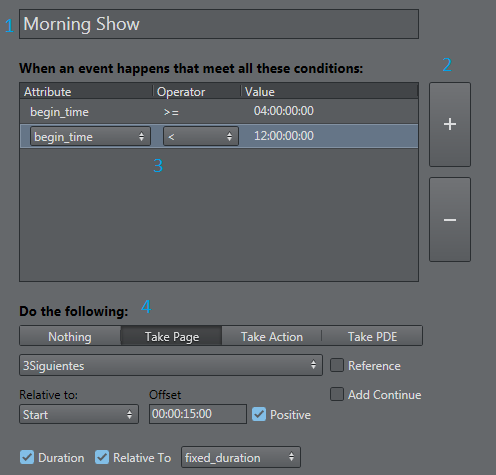 Conditions are made up of an attribute representing a column in the playlist table, an operator (greater than, less than, equal to, etc.) and a value (time, number, text). Only when the condition as defined is met will the rule be applied on a particular event. Likewise, when there are multiple conditions, only when all of them are met will the rule be applied to an event.