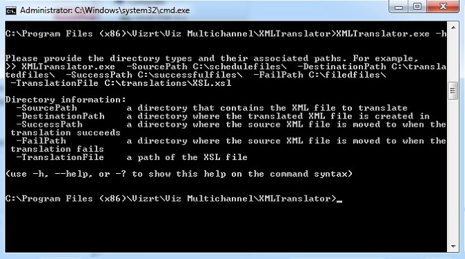XMLTranslator.exe -SourcePath %path% -DestinationPath %dpath% -SuccessPath %spath% -FailPath %fpath% -TranslationFile %tpath%\XSL.xsltThe example invocation above is on one line. All arguments are required. To get usage instructions, run the program with the help flag (-? or -h or):