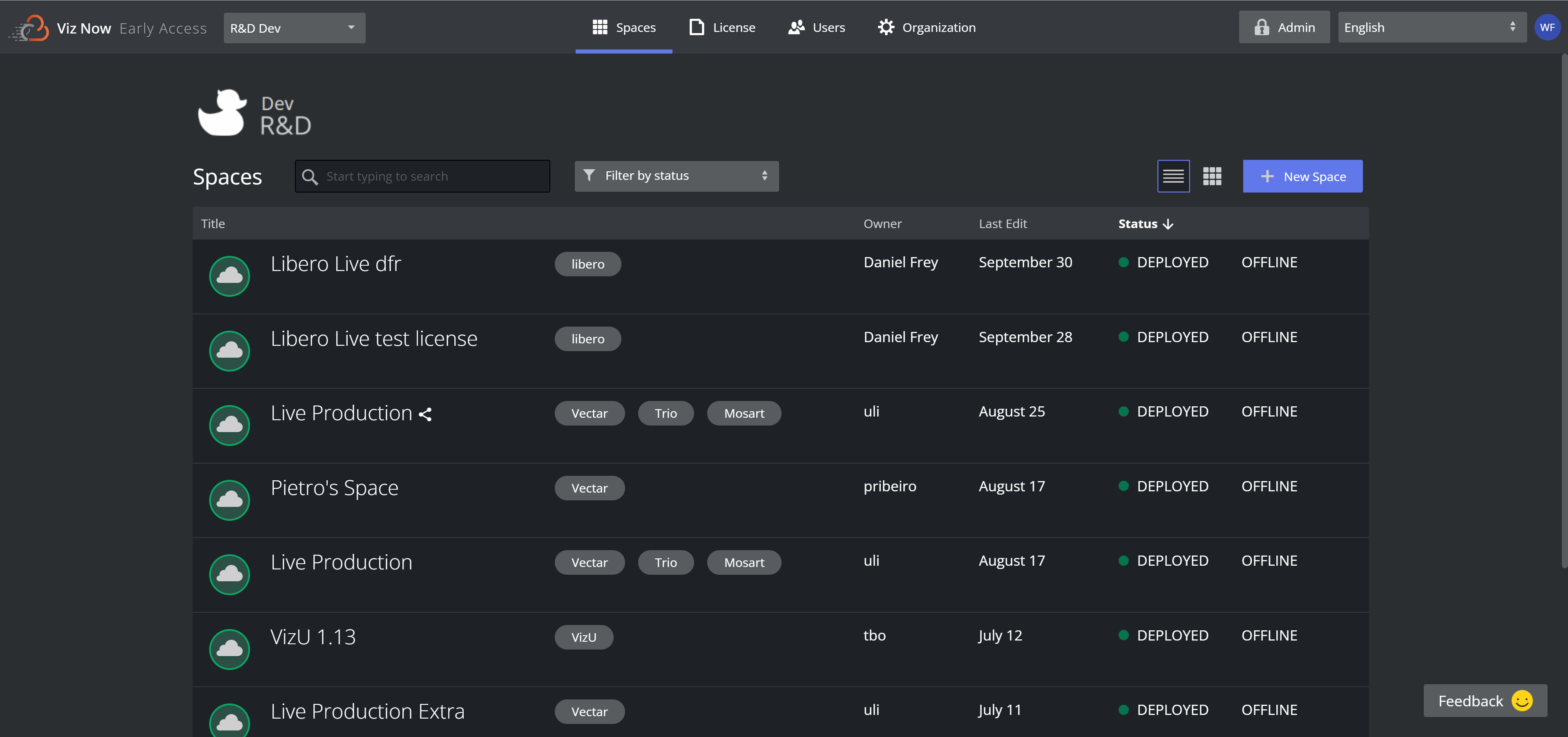 Your first view of Viz Now is the Spaces tab, displaying recently used workflows.