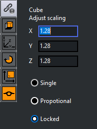 It is possible for scene designers to expose transformation properties for a tab field, as well as an active or inactive toggle. The following properties can be edited if enabled. They are displayed as buttons on the left side of the editor, from top down: