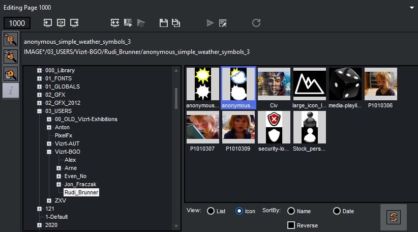 Browse Viz Artist: Opens a browser in the Page Editor for browsing images on the Viz Engine. It's possible to sort by name and date. For convenience both sorting actions can be reversed and refreshed.