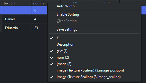 Customizing a Table View: Right-click on the table header bar, to make a context menu appear. Columns can be hidden or shown by selecting or unselecting the column. The table editor context menu contains the following columns: