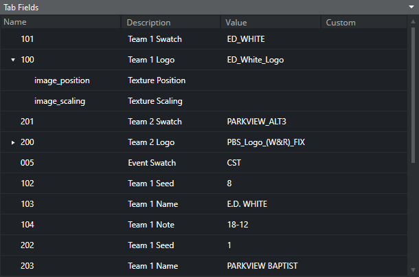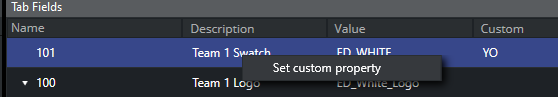 The Custom column now appears in the tab field panel. Now that the custom column is enabled, it is possible to edit or add a tab field’s custom value using one of two methods. The first is via the Set custom property dialogue box and the second is with a macro command. The two methods are described below.