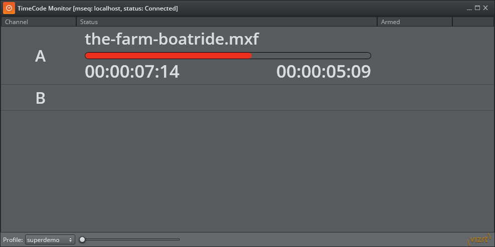 The TimeCode Monitor (TC Monitor) shows the progress of the current video clip on a specific channel.