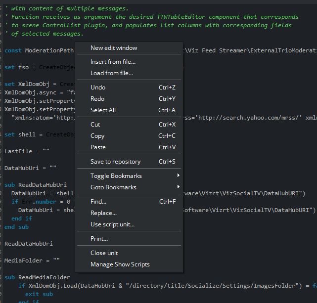 Note: Versions of Viz Trio prior to 3.0 store scripts in C:\Program Files (x86)\Vizrt\Viz Trio\scripts. Script files for a scripted show or template are copied to the Viz Trio script folder.
