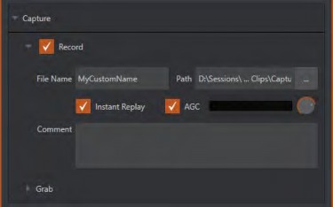 Each Switcher source has a Capture group in the Input tab. This control group shows settings and options for grabbing still images and, for appropriate sources, recording. These important capabilities are discussed in full in Record, Grab and Replay. The controls shown in are detailed in Record.