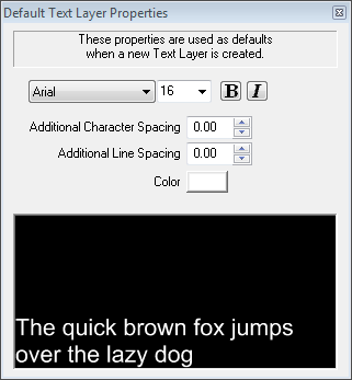 On the Styles menu, click Default Text Properties. The above dialog box allows you to specify the default font, size, style, spacing and color for new text layers.
