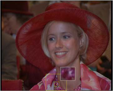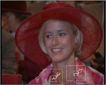5. If necessary move the central + to the precise position you want to track. This is the pin position that determines the precise offset generated by the track. Usually, you leave this at the center of the inner square. The outer square determines the search area that the tracking tool scans at each frame when looking for the feature you have specified. Its size should be sufficient to cover the maximum movement in any direction from any frame in the sequence to the next frame. It does not need to cover the area occupied by the feature of interest throughout the whole sequence.