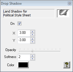 • Land Drop Shadow: Allows you to specify whether land is displayed with a drop shadow, and whether a drop shadow is also displayed for lakes/wide rivers and/or narrow rivers. Click the Settings… button to define the shadow.