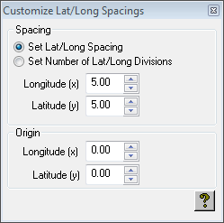 • To alter the spacing of the longitude and latitude lines, choose an option from the appropriate line spacing pop-up menu, or choose Custom and click the Customize Spacings… button to specify the spacing or number of divisions and origin explicitly: