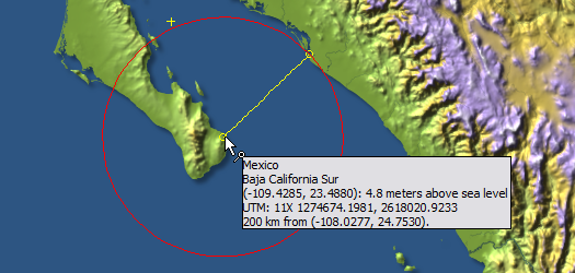 Drag from the start point to the end point of the distance to be measured. The display shows the location and height above sea level of the end point, and the distance between points: