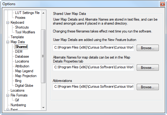 The user map details, alternate place names and abbreviations databases can be shared between users by placing them in a shared directory. This allows users to benefit from any user map details and new names added to the database.