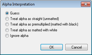 Click the Alpha... button to display the Alpha Interpretation dialog box. By default Guess is selected, which automatically selects the best option in most situations. Choosing the correct option should produce an image without noticeable banding, fringes, or speckling around the edges. You can choose one of the other options if Guess does not give the results you expect, or Ignore alpha to treat the image as if it had no transparency.