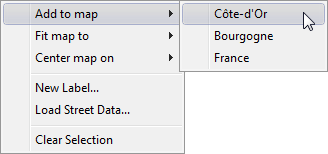 Right-clicking the layer displays a context menu that allows you to add a country or region to the map, fit the map to a country or region, center the map on a country or region, add a new label to the map, or clear the selection.