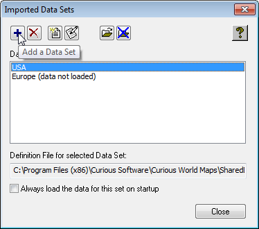 Once you have added a data set, it is remembered for future use of Viz World Classic, so there is no need to add the data set to the list every time you start the software. If you want the data for the data set to be loaded automatically on start-up you can select the Always load the data for this set on startup box.