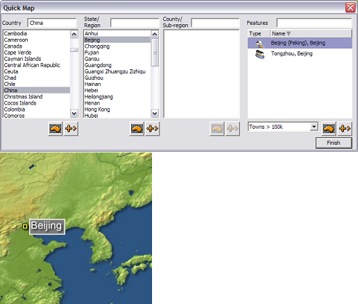 Pick Feature: Shows a group of available places from the database as “phantom labels”. This feature enables the userBrowse Map: Updates the browse window (on any click within the Map Area) with context information for the clicked position. The context information includes regions containing the position (for example country, state and county) and the capital of the country.