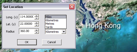 Set Location: Opens the Set Location dialog which enables the user To Set the Map Location using longitude, latitude and map size values (radius around the defined point).