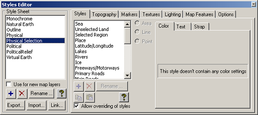 The user has the ability to define and fully customize all of the available map data elements via the Curious Maps Styles Editor. For example, the user can set region colors, select any TrueType font, assign any static image (images with alpha are supported) as a marker, modify shadow settings, change relief scale and lots more!