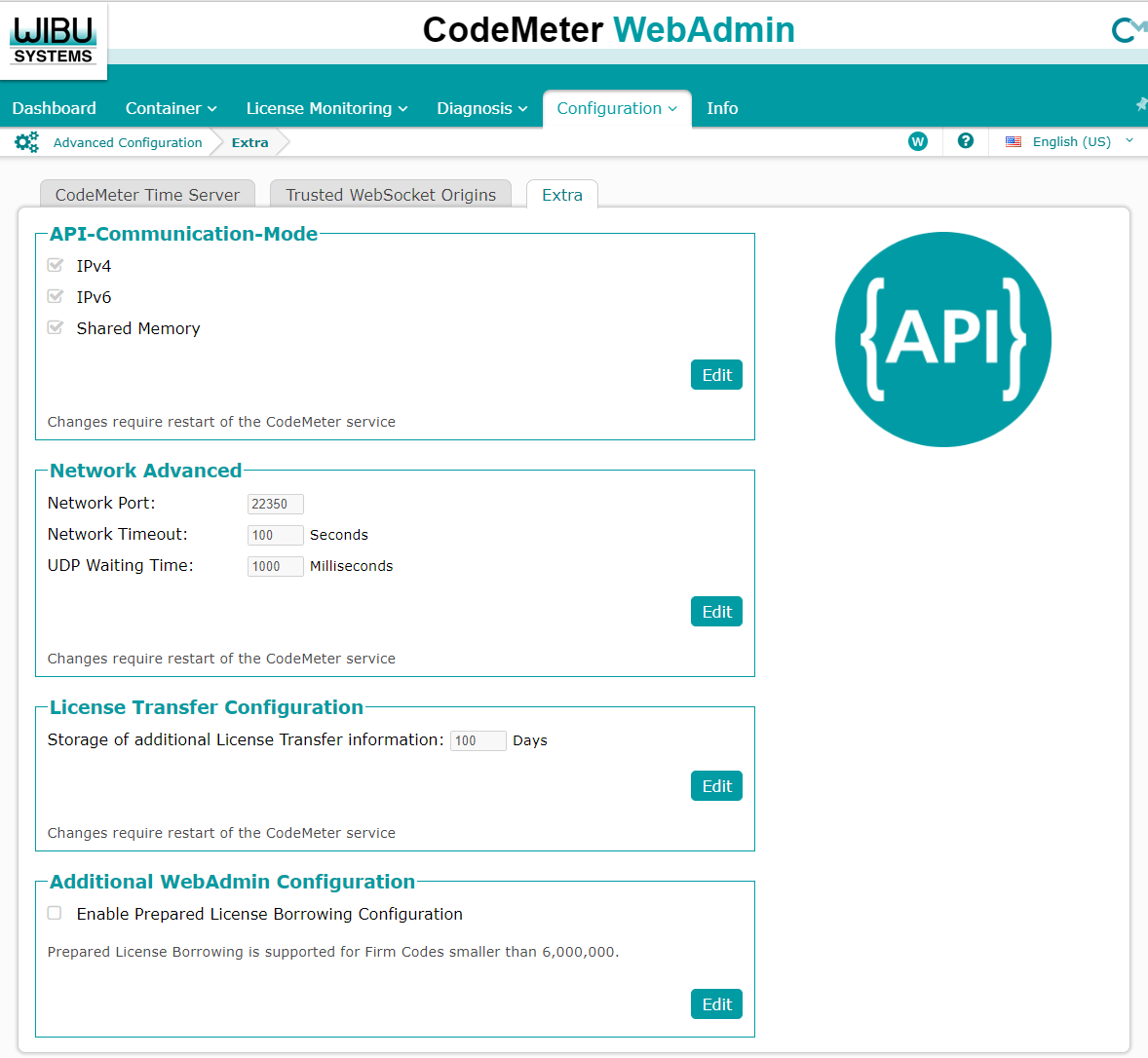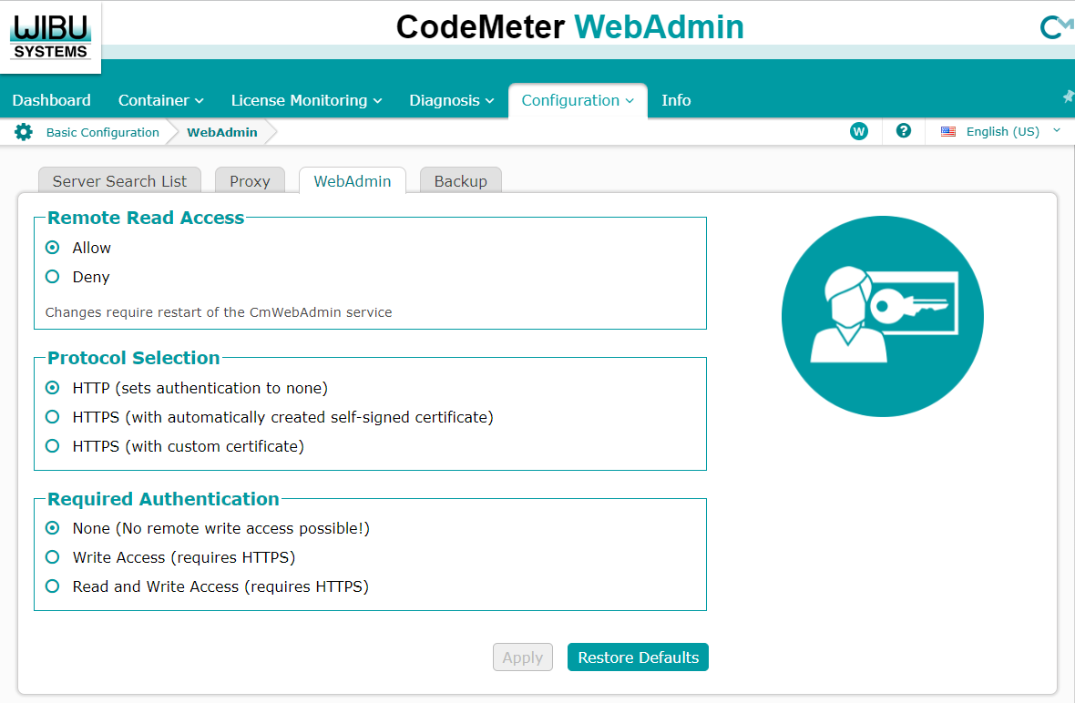 In the WebAdmin configuration, you can enable the read access to the CodeMeter WebAdmin from an external computer within the network range. In addition, it is possible to select the preferred protocol and authentication.