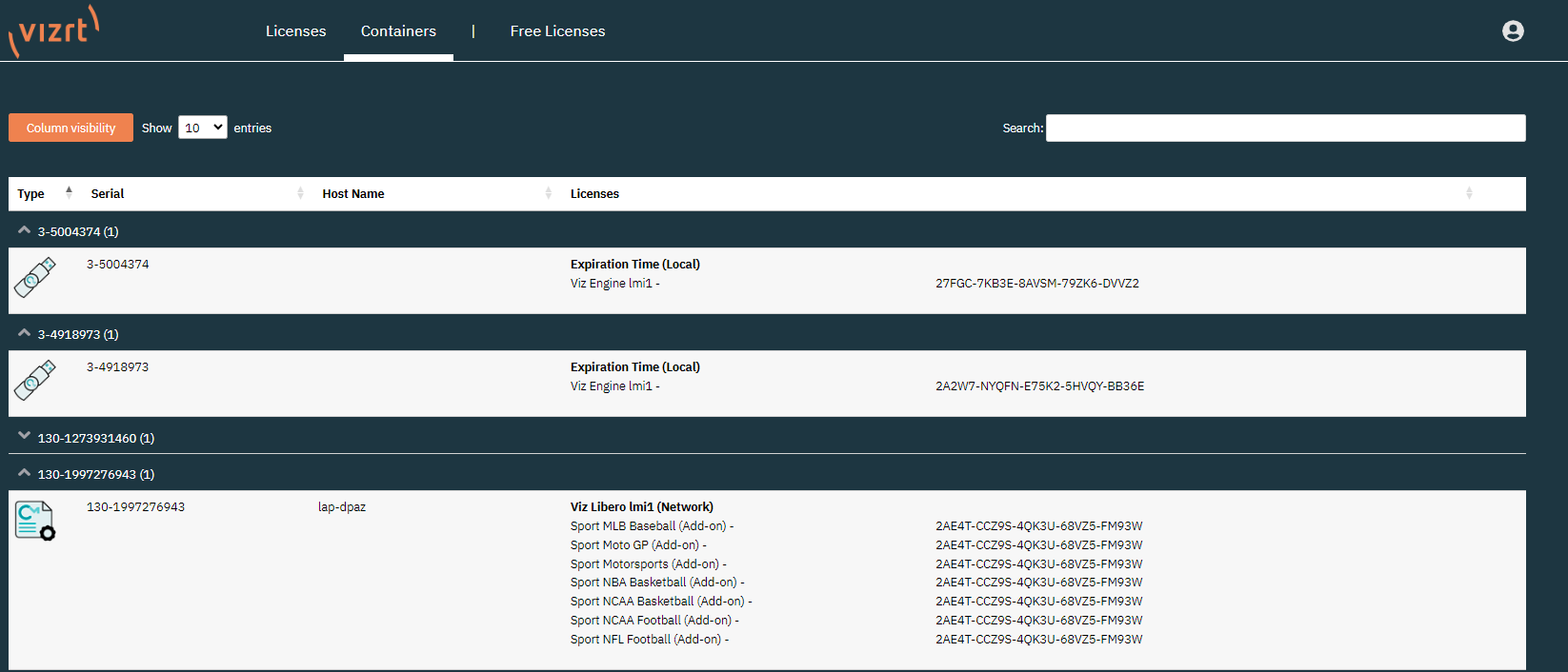The containers page shows the currently used license containers. This means that all license dongles that hold a license ticket of the account the user is assigned to, are displayed.
