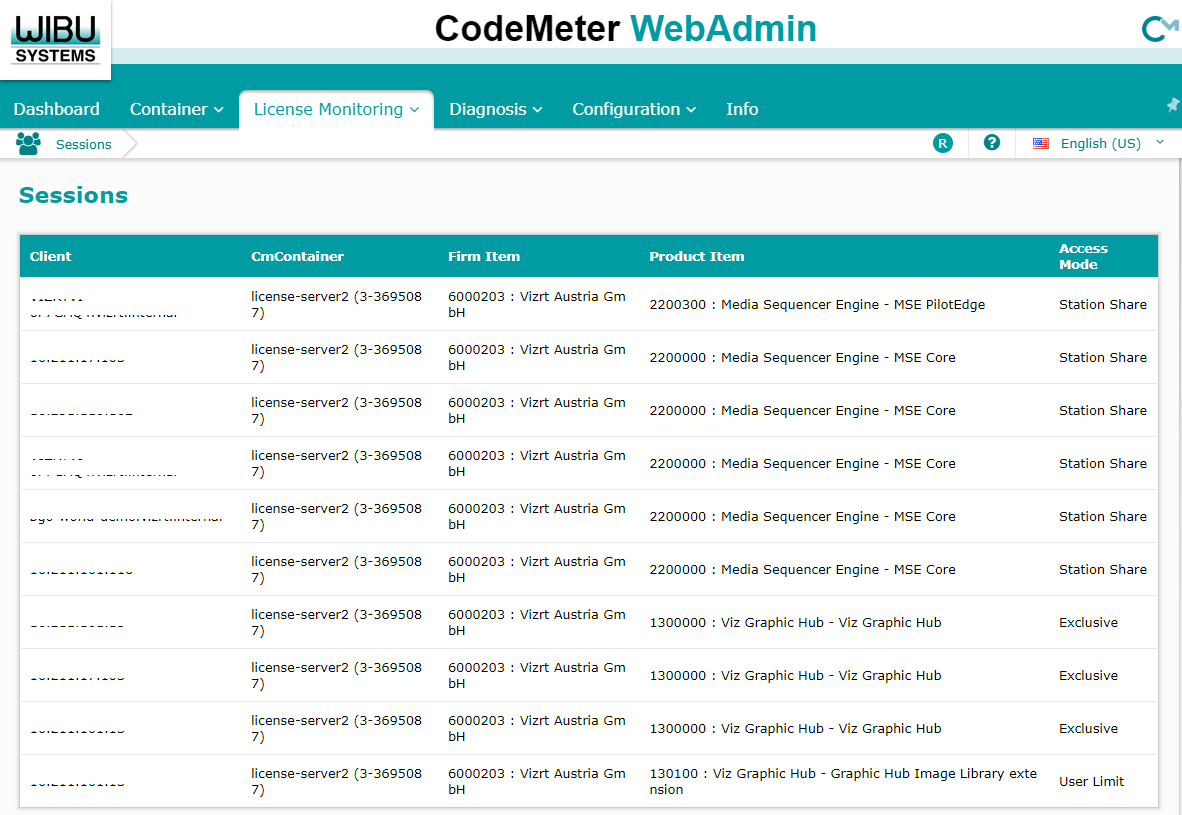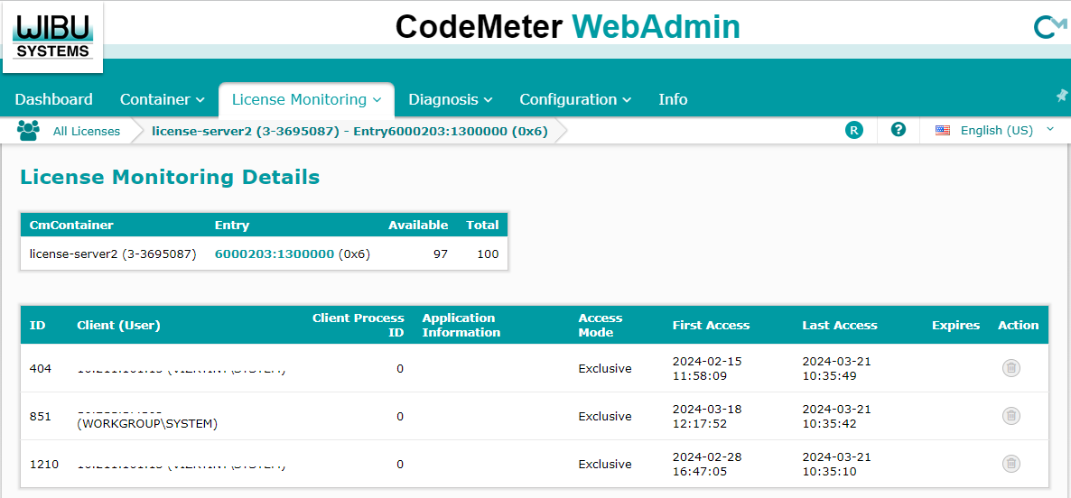 Info: The Action column allows you to terminate a connection of a client to that specific license item, and must be used with care.