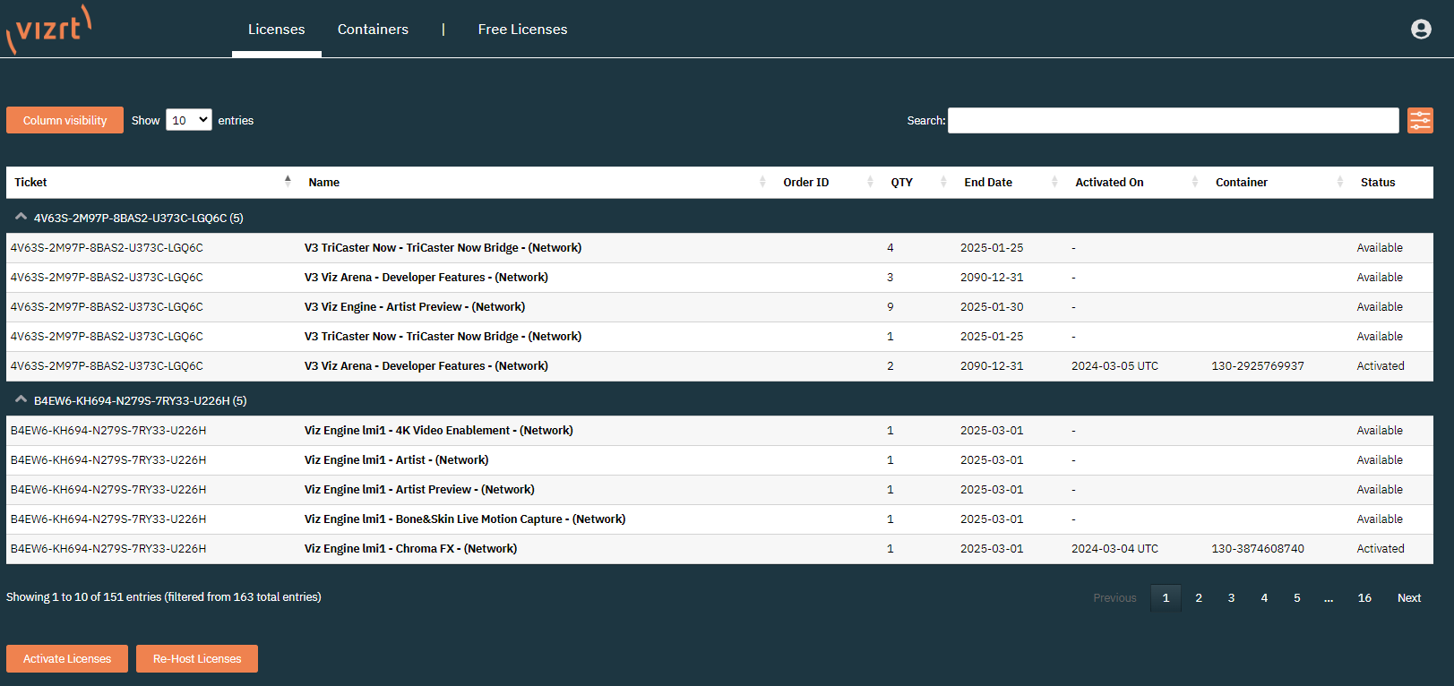 The licenses page provides an overview of licenses of the account the user is assigned to. The licenses are sorted by ticket ID showing all features each ticket has assigned.