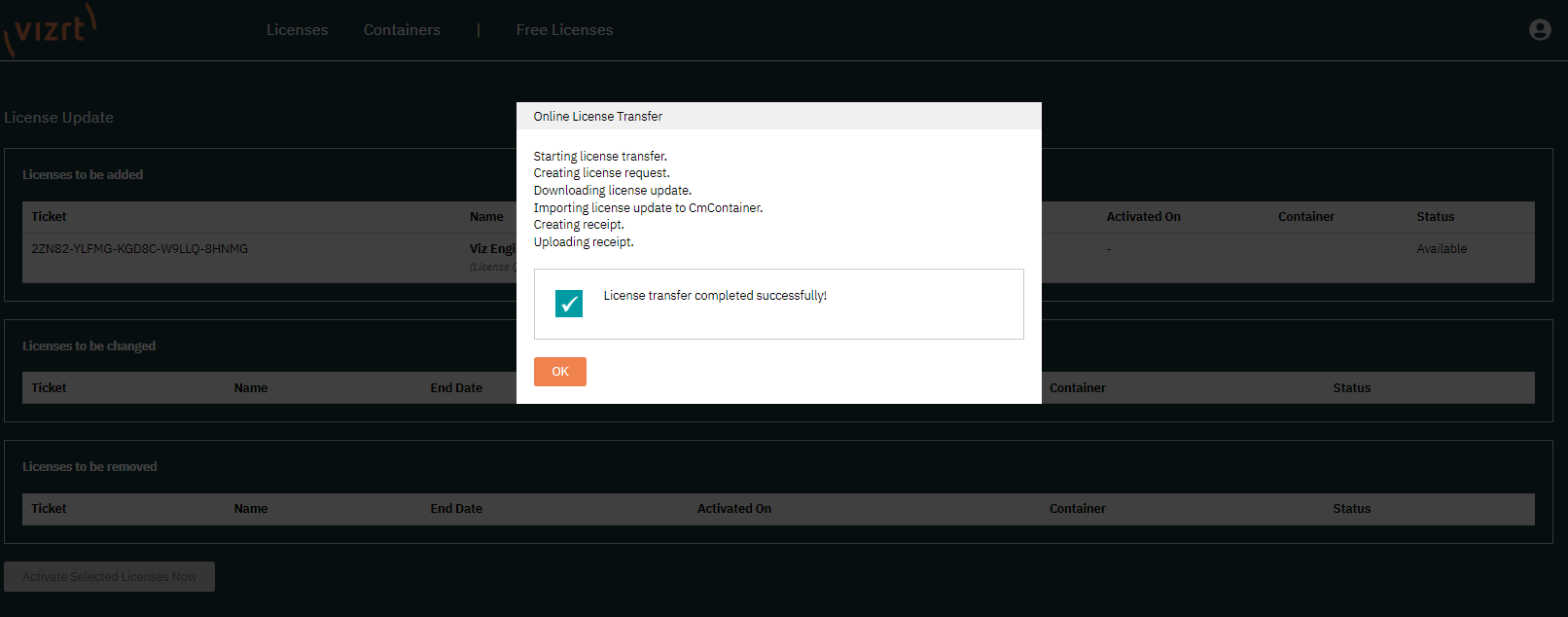 The summary page shows the licenses that are going to be added, changed or removed. For the activation process, licenses are added.