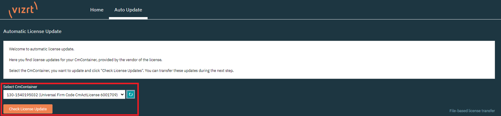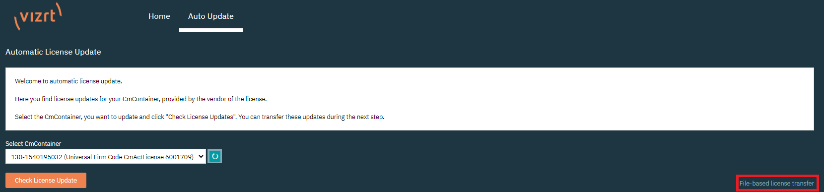 If a Container or Dongle is not located in the machine the Auto Update is executed, the Offline Activation can be used. To select the Offline Activation for Auto Update click on File-based license transfer.