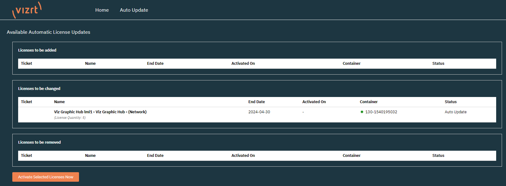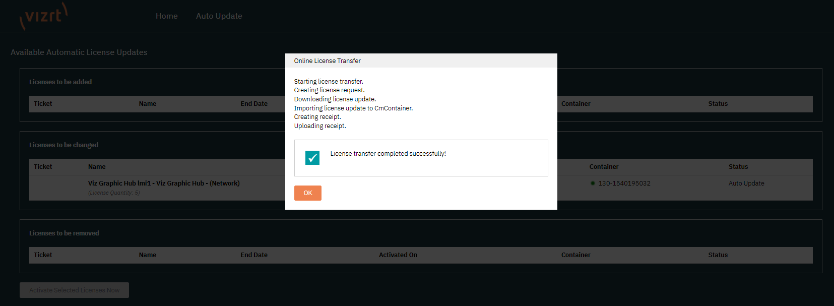 Clicking Activate Selected Licenses Now starts the Auto Update process on the Container or Dongle.